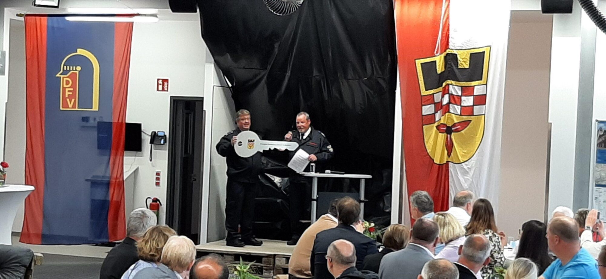 Im Anschluss an seine Rede reichte Ralf Tonetti den von Bürgermeister Hasenberg erhaltenen symbolischen Schlüssel an den Löscheinheitsführer Peter Wösthoff weiter.