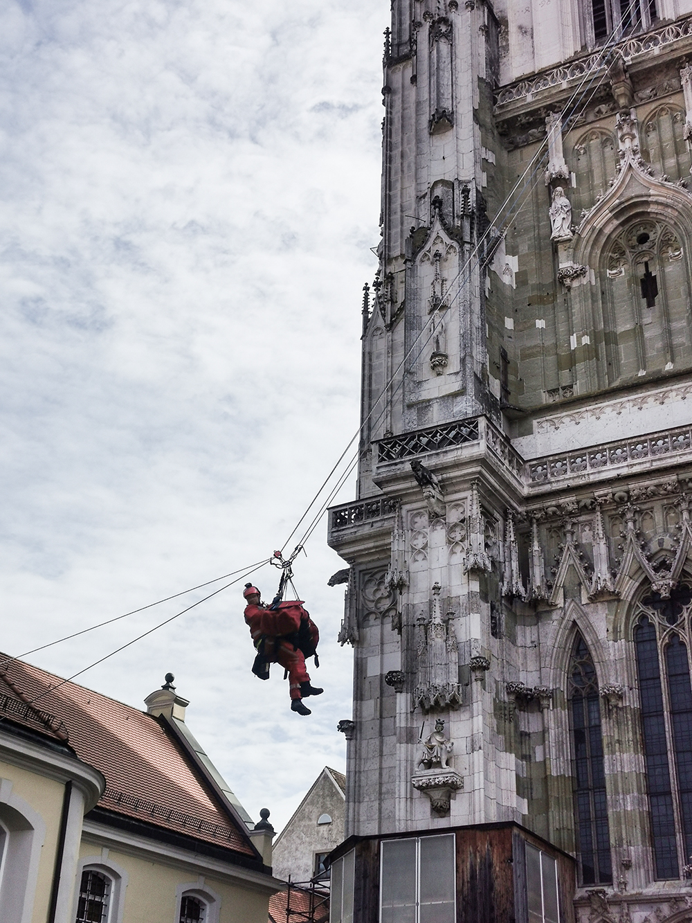 Die Höhenretter der Berufsfeuerwehr Regensburg bergen die verletzte Person, ein Mitarbeiter der Dombauhütte.
