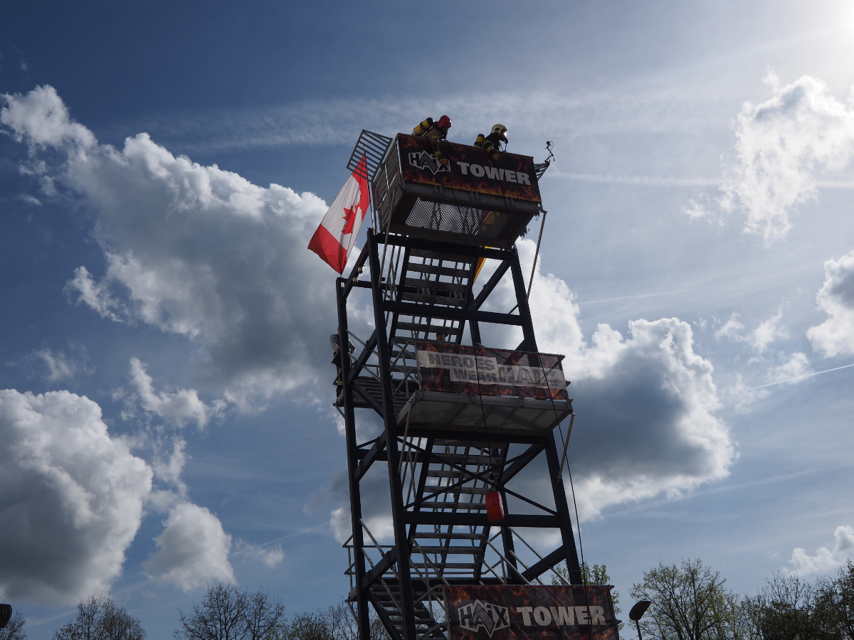 Mit einem aufgerollten Feuerwehrschlauch auf der Schulter gilt es, die Stufen des zwölf Meter hohen HAIX Towers zu erklimmen. Oben angekommen bleibt keine Zeit, die Aussicht über die Hallertau zu genießen. Ein weiterer Feuerwehrschlauch muss nach oben gezogen werden, bevor es wieder Dutzende Stufen hinunter zu den nächsten Stationen des Parcours geht.