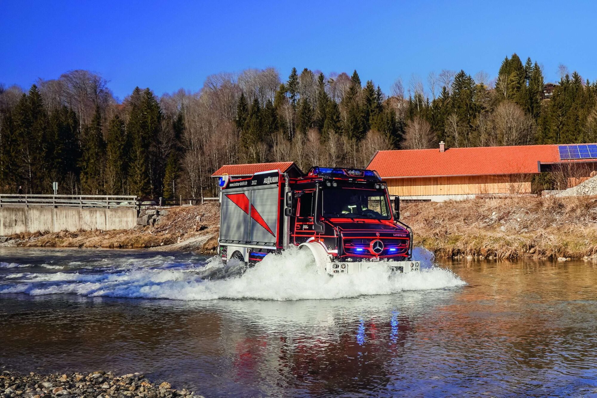 Bild: Das neue TLF 3000 Waldbrand auf Unimog U5023 mit Auxilium-Aufbau als Vorführfahrzeug mit schwarzer Beklebung. (c) Josef Lentner GmbH