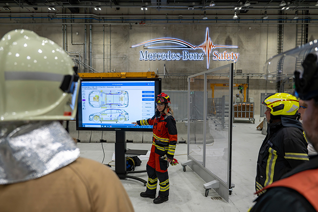Die Pilot-Veranstaltung von „MB4Rescue“ hat kürzlich im Technologiezentrum für Fahrzeugsicherheit (Crashtesthalle) in Sindelfingen stattgefunden. Teilgenommen haben Feuerwehr-Ausbilderinnen und -Ausbilder aus Deutschland, Österreich, der Schweiz und den Niederlanden sowie Teams der Feuerwehren aus nahezu allen deutschen Werken der Mercedes‑Benz AG. Trainieren konnten die Retter an aktuellen Mercedes‑Benz Modellen wie CLA, EQE, EQS, GLE und CLE.