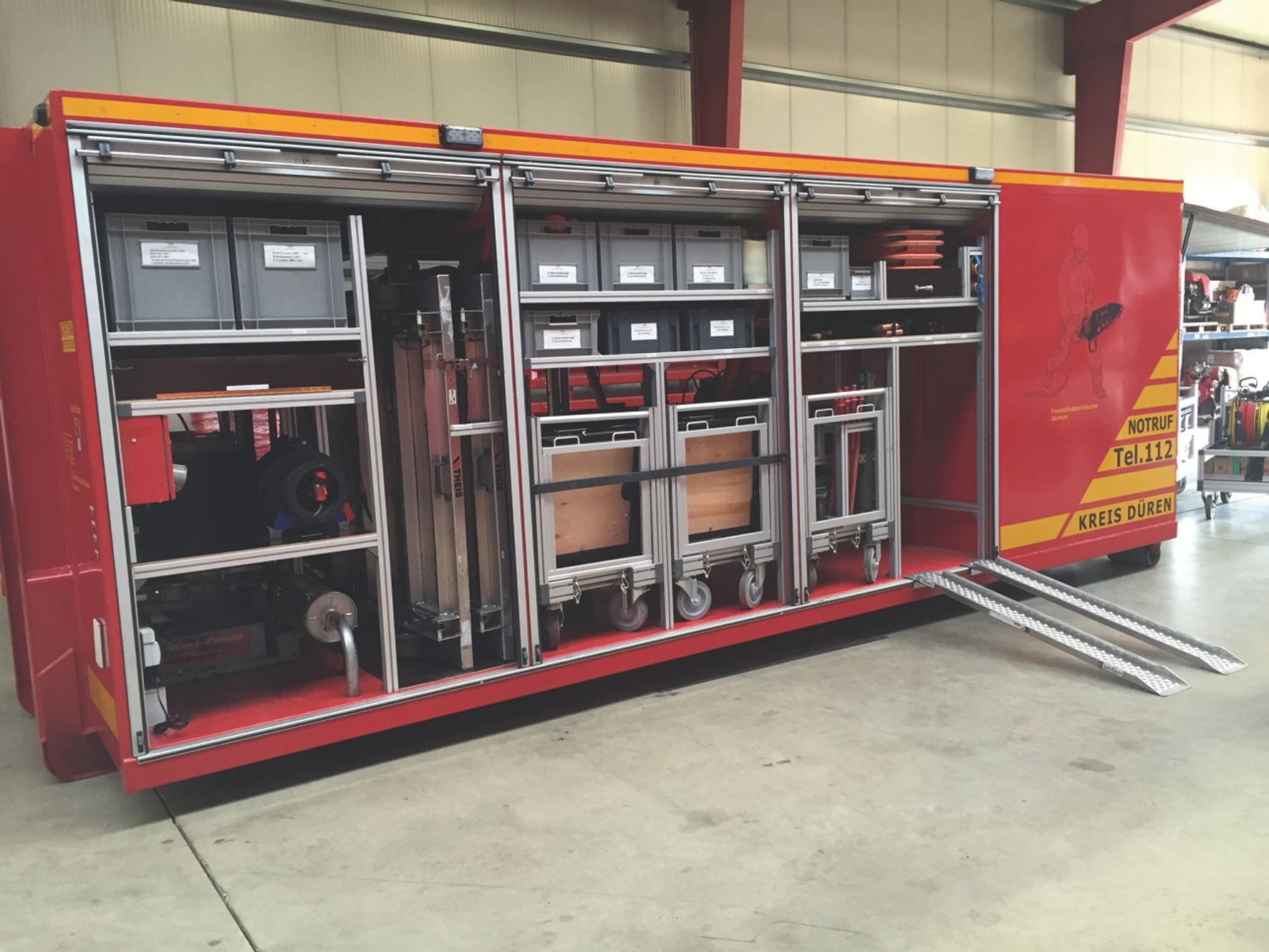 Eine weitere Besonderheit sind vorkommissionierte oder bereits montierte Baugruppen für Rollcontainer. MiniTec hat ein Standardmodul entwickelt, das der Richtlinie für die Konstruktion und Verwendung von nicht kraftbetriebenen Rollcontainern im Feuerwehrbereich entspricht. Alle Rollcontainer sind ausgestattet mit großen Lenkrollen mit Trommelbremsen, die einen stabilen Stand sicherstellen. Auf dieses Grundmodul kann sich jede Feuerwehr die individuellen Ablagen selbst aufbauen, wie beispielsweise Atemschutz, Transport, Licht, Wasserentnahme, Eisrettung, oder Gitterboxaufbauten. Auf Wunsch können die Grundmodule auch fertig montiert geliefert werden.