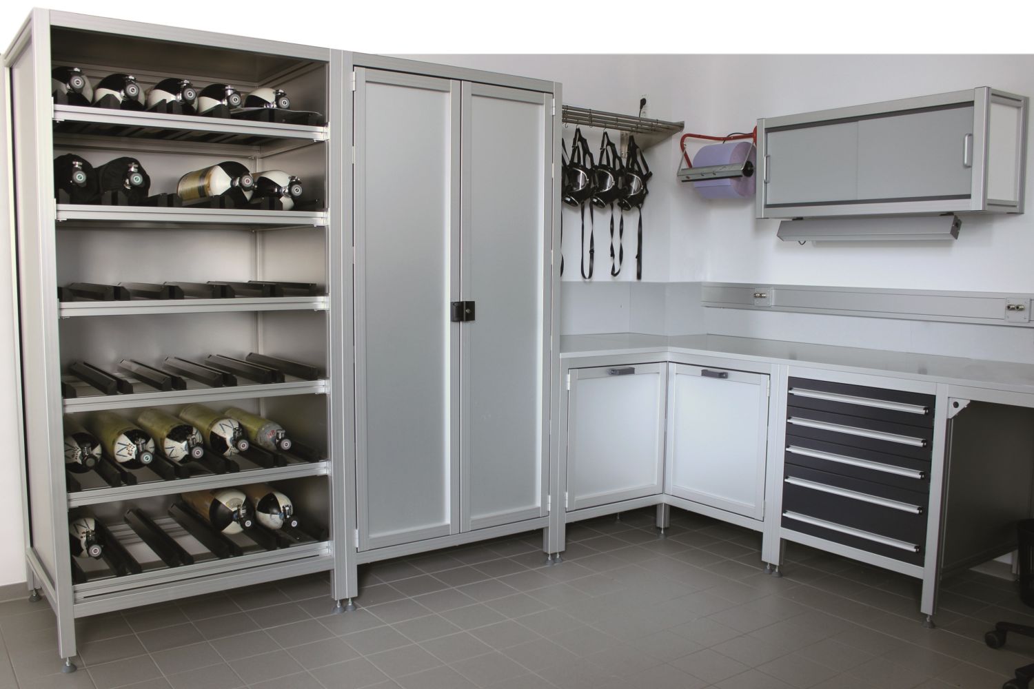 Das Baukastensystem von MiniTec dient als perfekte Basis für die Konstruktion und Installation von Werkstattbereichen und Werkstätten in Feuerwachen und Rettungsstationen (im Bild eine Atemschutzwerkstatt). (C) MiniTec