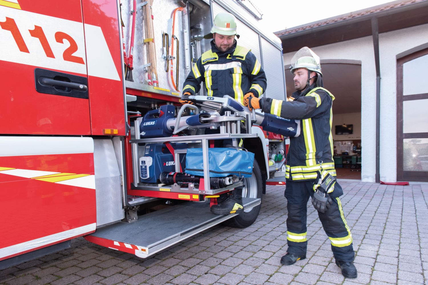 In enger Abstimmung mit führenden Herstellern von elektrohydraulischen Rettungsgeräten wurde eine Lösung zur speziellen Lagerung von akku-betriebenen Rüstsätzen entwickelt. Es ist sowohl eine horizontale als auch diagonale Lagerung möglich (je nach vorhandenem Stauraum im Fahrzeug). Am Einsatzort kann die Lagerung mit wenigen Handgriffen individuell an die Gegebenheiten angepasst werden. Die Lagerungen können sowohl als Bausatz oder komplett montiert geliefert werden.