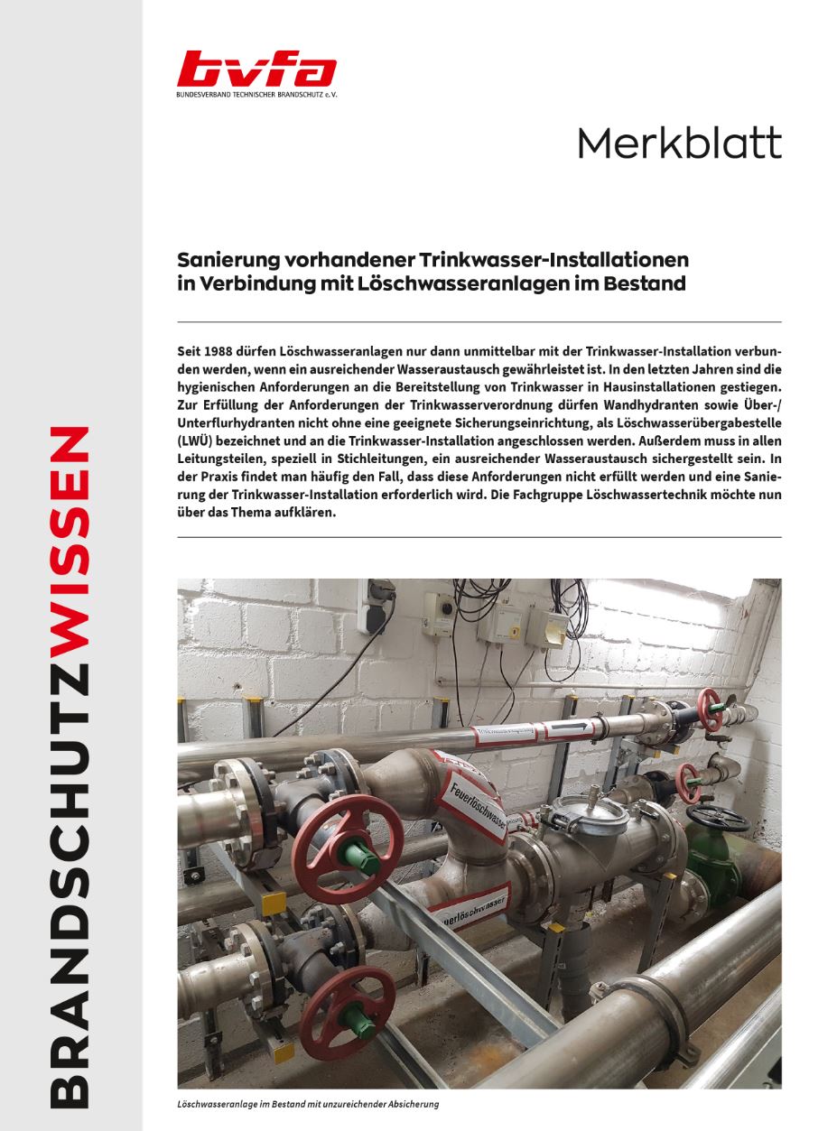Das Merkblatt „Sanierung vorhandener Trinkwasser-Installationen in Verbindung mit Löschwasseranlagen im Bestand“ (C) Bild bvfa