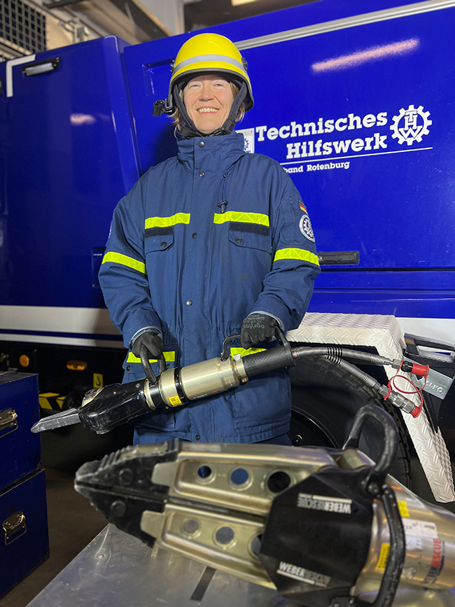 „Durch die Häufung der Katastrophen und auch die angespannte geopolitische Situation möchte ich frühzeitig lernen, wie ich als Ehrenamtliche im Fall der Fälle helfen kann. Zudem möchte ich mal mit Geräten arbeiten, die mir mein Beruf nicht bieten kann. Besonders freue ich mich auf die Ausbildung an der Motorkettensäge.“