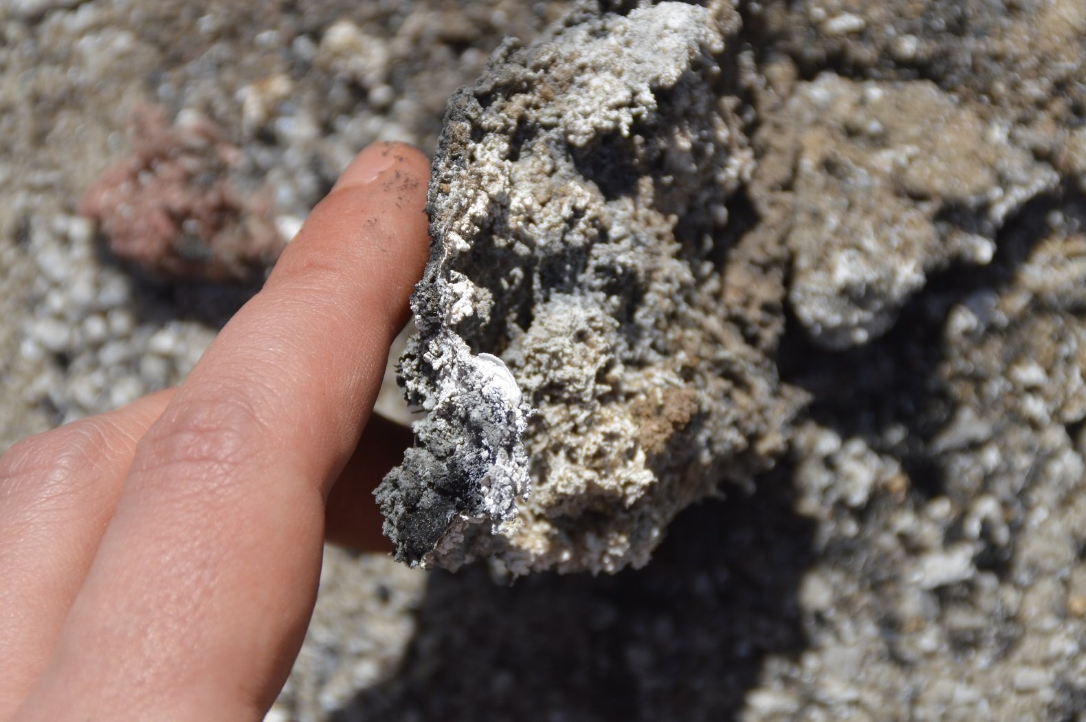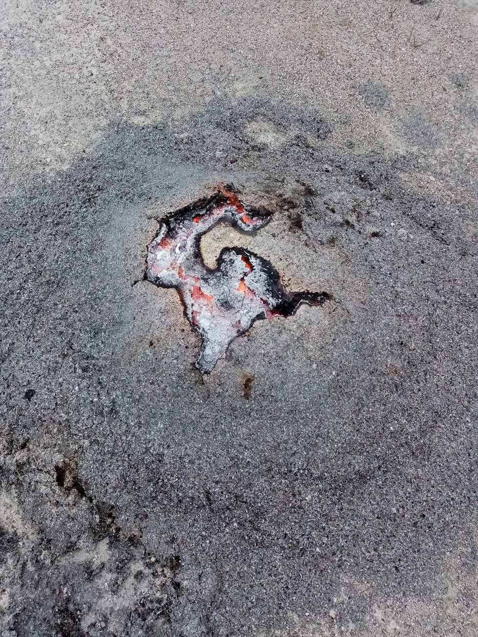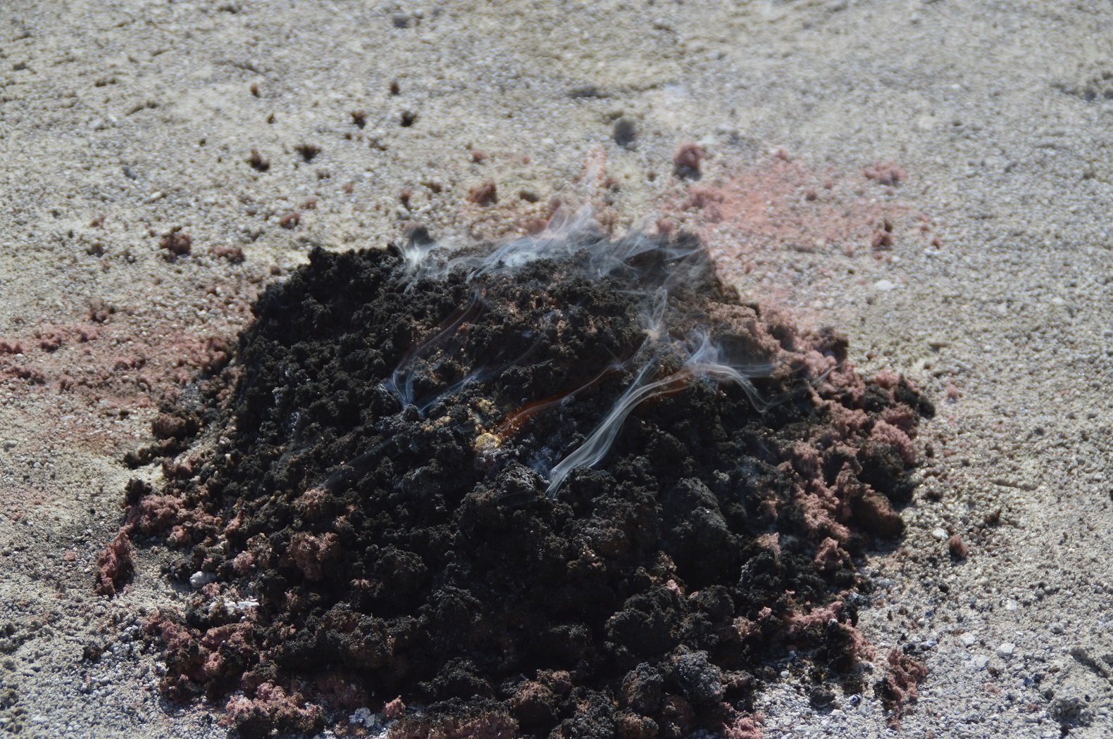 Die verkohlte Struktur wird mit der Zeit oxidiert, und eine glasartige Schicht aus den den Flocken zugesetzten Salzen bleibt übrig.